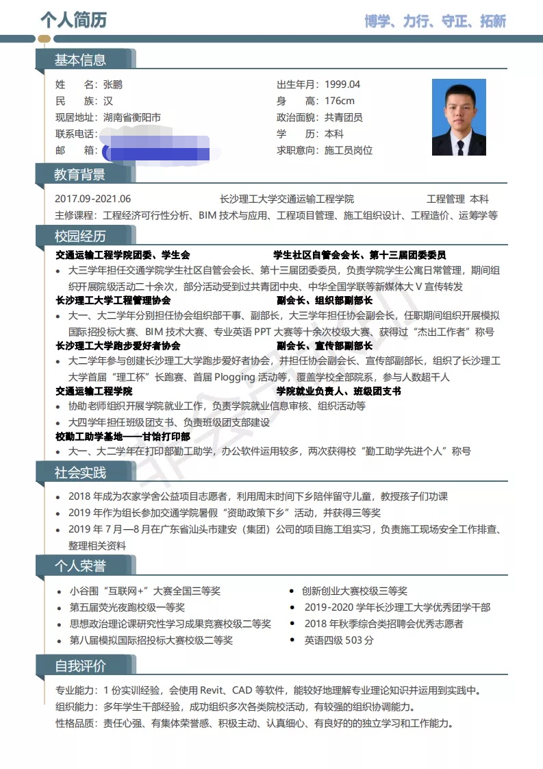 一份出色闪光的简历是毕业生必备的求职“利器”,在当前“后疫情”时期,其重要性更胜以往。此次比赛中,2021届全体毕业生主要围绕版面设计、内容结构以及表达效果等方面,结合求职目标与自身实际对简历进行了创新与完善。经专家、老师评审,道路1701班黄诗麒等5人,工管1703班张鹏等10人,交运1702班肖东翔等20人,工管1702班陈茂森等40人分别获评一等奖、二等奖、三等奖和优胜奖。不仅如此,学院还将专家、老师点评建议逐一与毕业生进行反馈,同步修改完善。