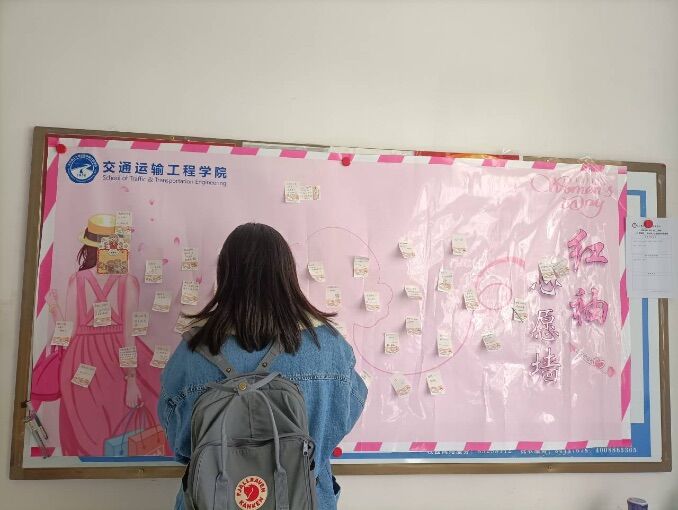 3月7日和8日,学院分别在金盆岭校区西苑二栋和云塘校区敏行轩的公示处张贴心愿墙,女生们写下心愿,贴上便签,由交通青年们彼此实现,并留下美好祝福。妇女节当天,同学们集思广益,制作精美的贺卡,为身边的女性朋友和长辈送上祝福,表达敬意。