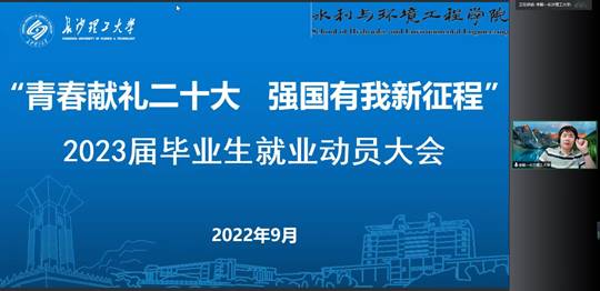为帮助毕业生更好了解就业形势、提升就业能力、推动毕业生高质量充分就业,9月2日,水利与环境工程学院以线上视频会议的形式召开“青春献礼二十大、强国有我新征程”2023届研究生就业动员指导大会。院党委副书记银波、副院长李毅出席指导,学工办李永睿老师参加,2023届全体研究生参与,会议由李永睿主持。