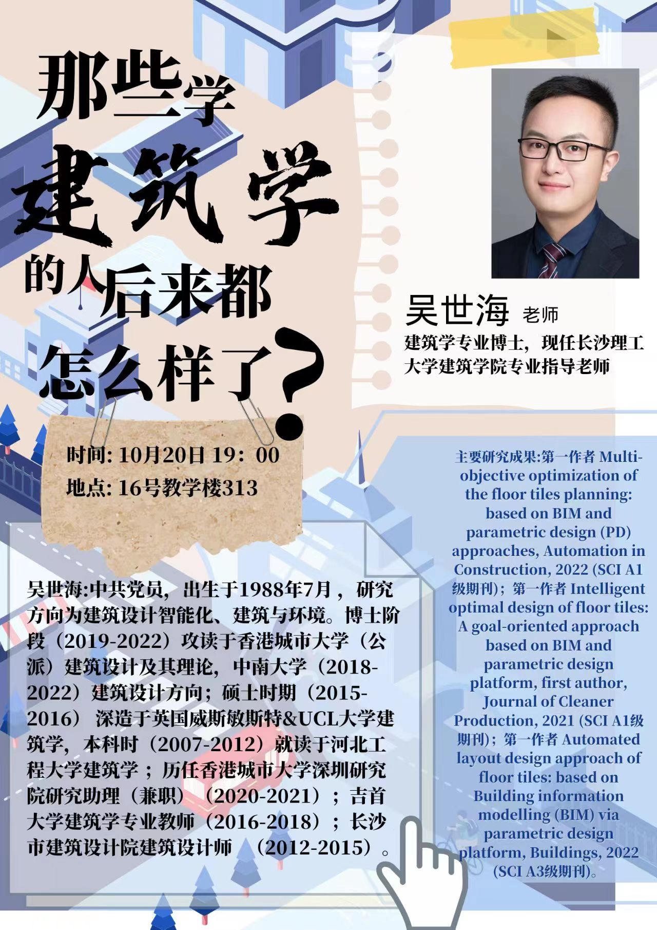 为了帮助2022级新生更好的认识建筑类专业,树立专业自信。10月20日,建筑学院在16教313举办了2022级新生专业启蒙教育暨青年博士论坛第一讲,特邀青年博士吴世海作主题为“那些学建筑的人后来都怎么样了”的专题讲座,学院党委副书记李家春、2022级辅导员郭恒以及2022级本科生参加。