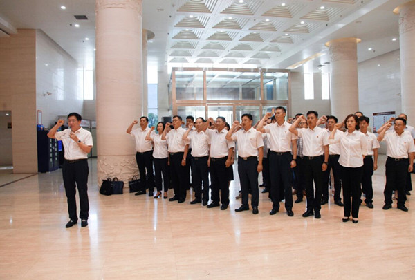 活动最后,在革命伟人雕像前,付宏渊带领全体党员干部面对鲜红党旗紧握右拳,重温入党誓词。掷地有声的誓言,表达出每一位党员干部“不忘初心、牢记使命”的坚定信念,也彰显了作为中国共产党员的责任与光荣。