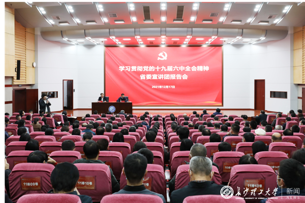 根据省委统一部署,12月17日下午,省委宣讲团成员、湖南第一师范学院党委书记罗成翼来永利官网宣讲党的十九届六中全会精神。校党委书记付宏渊主持宣讲报告会,全体在家校领导出席,副处级以上干部、马克思主义学院教师和辅导员代表三百余人与会。