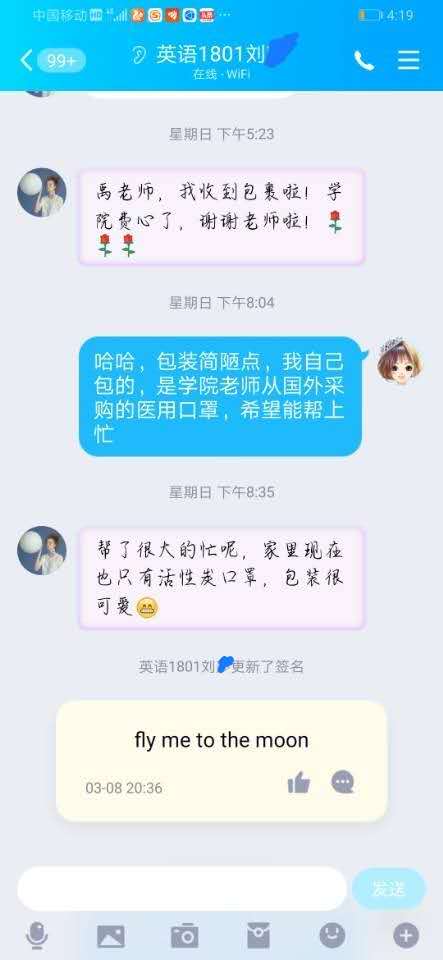 “疫情发生后,学院老师一直很牵挂我们,经常关心问候家中情况,还特意给远在武汉的我们寄送口罩,包装都特别用心暖暖的微笑图案,感谢学院我家终于可以换掉活性炭口罩啦!”家住湖北武汉的大二学生刘同学说道。