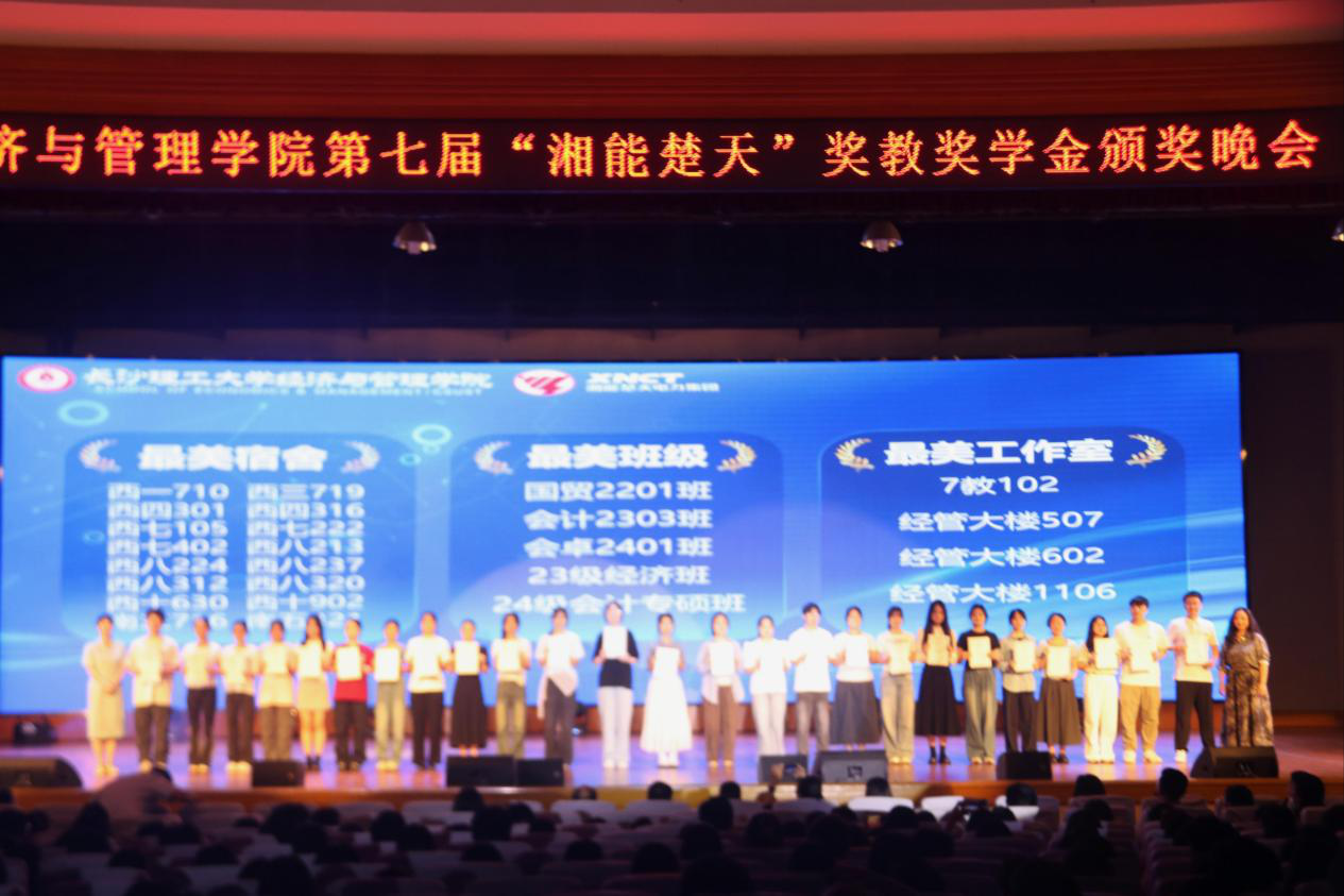 5月27日晚,经管学院第七届“湘能楚天”奖教奖学金颁奖晚会在五教大礼堂举行。湘能楚天电力集团董事长陈伟其、党支部副书记王丽杰,校党委委员、副校长刘朝晖,校友中心主任唐青,创业就业指导处副处长贺佐杰,校团委副书记陈璐莎,经管学院全体班子成员、全体辅导员、专业老师代表和学生代表上千人齐聚一堂,共襄盛举。