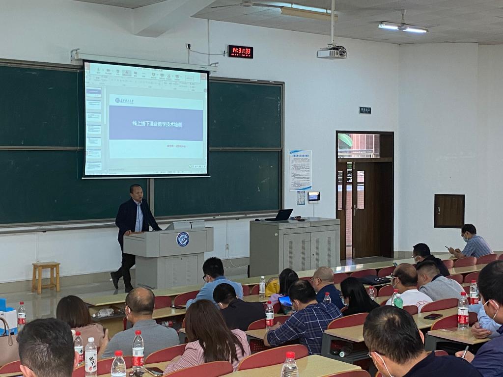 10月18日下午,信息化中心、教务处在综合教学楼B102组织开展教师线上线下混合教学技术培训。各教学副院长、系(室)负责人等50余人参加了现场培训,腾讯会议线上参会200余人,本次培训由信息化中心主任王威主持。