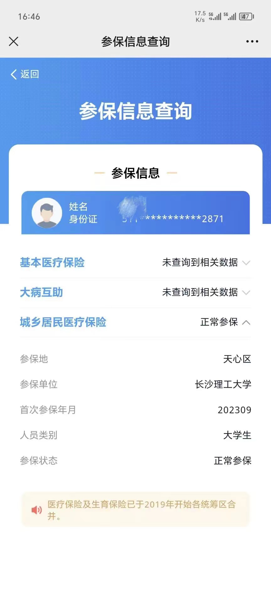 三、查询大学生医保“参保信息”,点击进入后截图可作为参保证明,微信登录操作过程中出现一片空白或者别的问题可换用支付宝登录查询