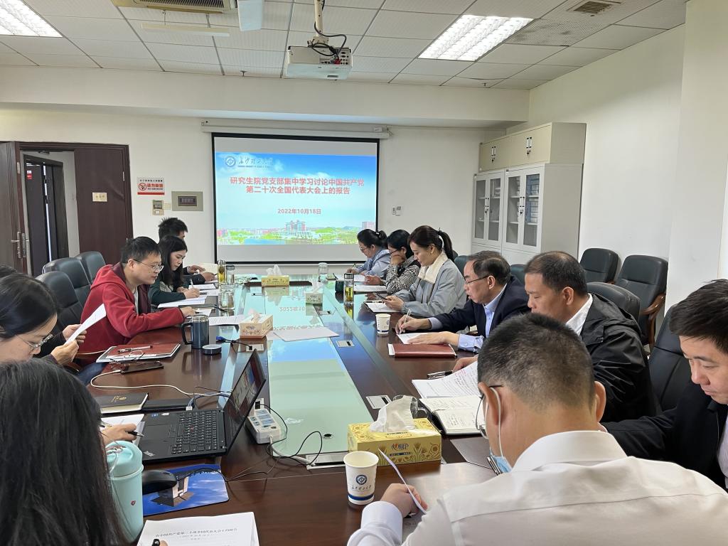 10月18日上午,研究生院在一办公楼B202会议室集中学习讨论习近平总书记在中国共产党第二十次全国代表大会上的报告。支部书记龙科军主持,研究生院全体成员参加并作交流发言。