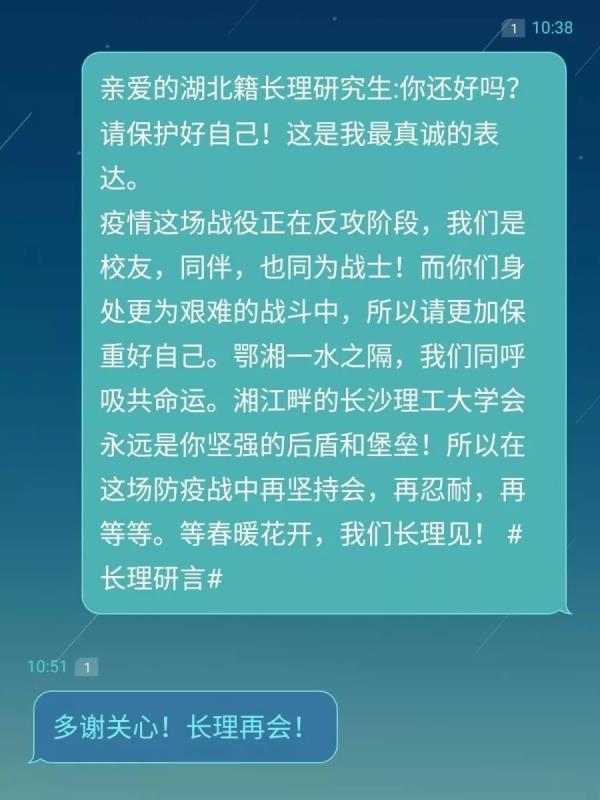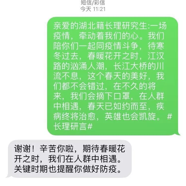 短信征集计划发布以来得到了广大师生的积极响应,导师和研究生纷纷发来自己的祝福“请你们坚定信心,我们永远是你们坚强后盾,我们在长理等候你们平安归来”、“这是一个互相分离又紧紧相依的寒假,疫情无情,人间有爱,希望湖北籍的同学们平安健康,武汉加油,中国加油”、“爱和希望比病毒的蔓延更快,同学莫慌,我们在长理等你”、“风雨同舟,绝不放弃”……来自全国各地同学们的祝福,让身处疫区的同学们深受感动。大家纷纷表示一定积极配合相关部门和学校工作,和家人一起做好防护工作,保证平安返校!