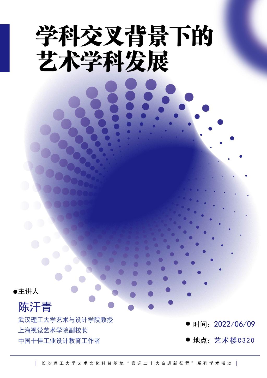 为响应习近平总书记“夯实学科基础,培育新兴交叉学科生长点”的教育创新战略,永利集团88304官网艺术文化科普基地于2022年6月9日开展了“学科交叉背景下的艺术学科发展”专题讲座。本次讲座邀请武汉理工大学艺术与设计学院教授、博士生导师陈汗青教授担任主讲嘉宾。