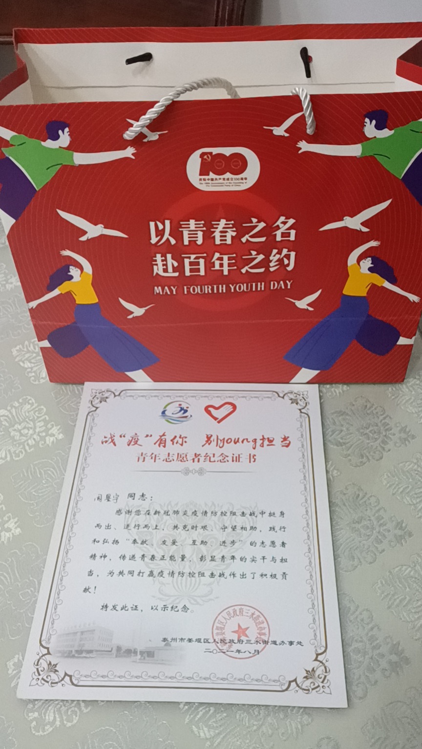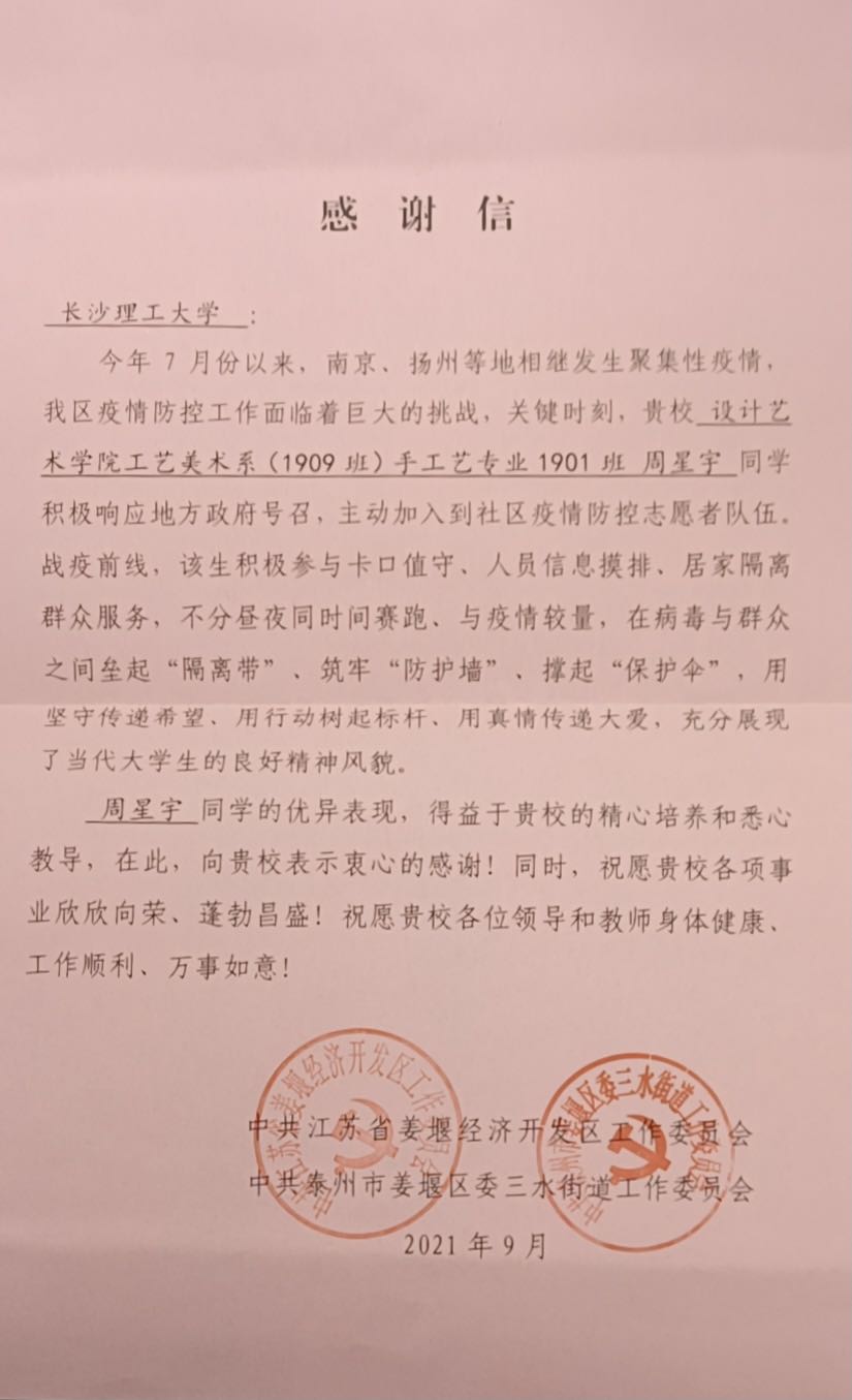 “今年7月份以来,南京、扬州等地相继发生聚集性疫情,我区疫情防控工作面临着巨大的挑战,关键时刻,贵校设计艺术学院工艺美术系(1909班)手工艺专业1901班周星宇同学积极响应地方政府号召,主动加入到社区疫情防控志愿者队伍。战疫前线,该生积极参与卡口值守、人员信息摸排、居家隔离群众服务,不分昼夜同时间赛跑、与疫情较量,在病毒与群中之间垒起‘隔离带’、筑牢‘防护墙’、撑起‘保护伞’,用坚守传递希望、用行动树起标杆、用真情传递大爱,充分展现了当代大学生的良好精神风貌。”9月7日,永利集团88304官网收到了这封由中共江苏省姜堰经济开发区工作委员会、中共泰州市姜堰区委三水街道工作委员会发来的感谢信。