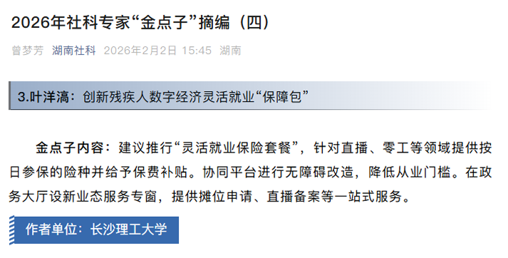 叶洋滈副教授聚焦新业态残疾人从业者权益保障与就业便利,建议创新残疾人数字经济灵活就业“保障包”:推行“灵活就业保险套餐”,面向直播、零工等领域开发按日参保的险种并给予保费补贴;协同相关平台开展无障碍改造,切实降低从业门槛;在政务大厅设立新业态服务专窗,提供摊位申请、直播备案等“一站式”服务。该建议体现了对数字经济新趋势和民生保障新需求的敏锐把握,为增强新就业形态残疾人群体获得感、幸福感提供了制度创新方案。