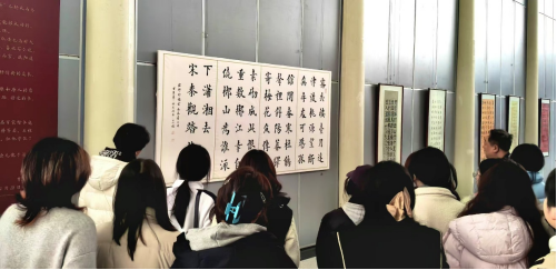 3月23日,永利集团88304官网设计艺术学院数字媒体艺术创新班师生一行走进湖南省文化馆,开展了一场别开生面的现场书法课教学活动。同学们在任课教师刘亚东老师带领下,参观了正在这里展出的“历代名人咏湖湘——守正·第五届全国百家楷书邀请展”,在翰墨书香中感悟湖湘文脉,汲取艺术养分。