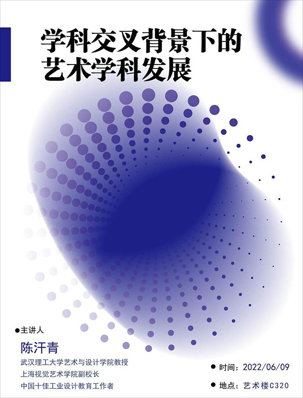 为响应习近平总书记“夯实学科基础,培育新兴交叉学科生长点”的教育创新战略,永利集团88304官网艺术文化科普基地于2022年6月9日开展了“学科交叉背景下的艺术学科发展”专题讲座。本次讲座邀请武汉理工大学艺术与设计学院教授、博士生导师陈汗青教授担任主讲嘉宾。