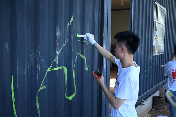 下午四时,经过实践团全体成员同工作人员就最新一版方案进行讨论,确定了集装箱上的插画内容、果园标示牌的IP形象及名称,并积极展开工作。晚上七时,集装箱彩绘大致轮廓及色块初见雏形。