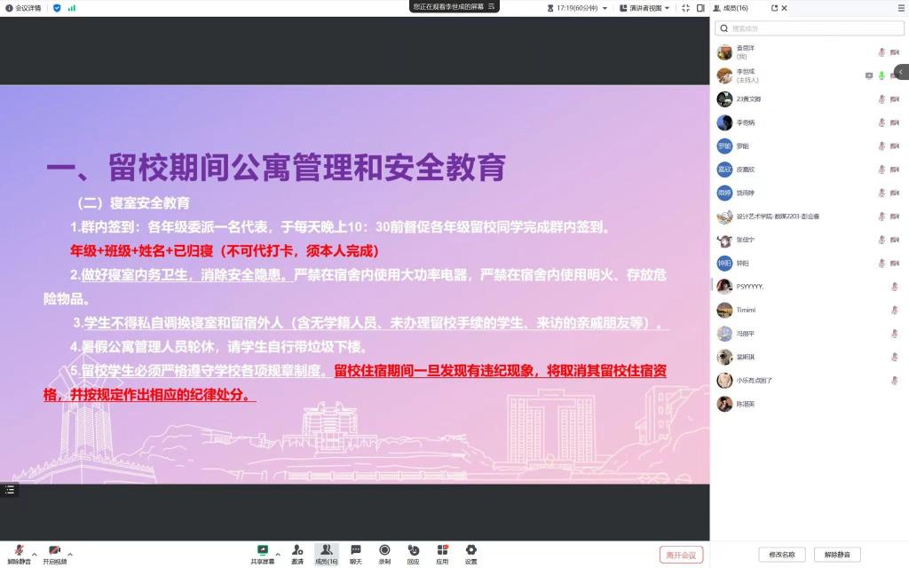 为切实做好2024暑期留校学生教育管理工作,维护校园安全稳定,7月11日下午2时,设计艺术学院于腾讯会议召开2024年暑假留校学生安全教育会议,学工办辅导员、全体留校学生参加会议,会议由2021级辅导员李世成主持。