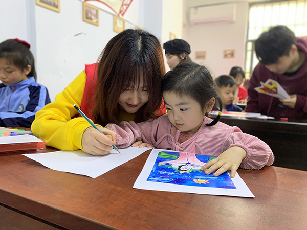 在雨过天晴的春日,“藝力量”志愿者来到云塘社区格兰小镇与小朋友们一起度过周末的下午。在小朋友的画笔下,一幅幅绿色盎然的景象映入眼帘,每一位志愿者都与小朋友们有默契的行走画笔,在薄薄的白纸上画出美丽的风景。志愿者们同小朋友一同描绘春意盎然的景象,“共建生态环境”的主题在画纸中展现出来,小朋友们也同样享受绘画的时光,脸上洋溢着欢快的笑容。