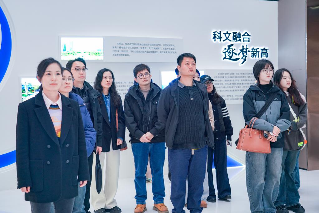 马栏山视频文创园管委会副主任刘飞、行政审批服务局局长陈铭、副局长罗欣灿等热情接待了郭剑一行。在园区工作人员的引导下,走访团队先后参观了马栏山科文融合展厅,通过沉浸式体验、实物展示与图文介绍,详细了解了园区的发展历程、产业布局、核心技术研发及重点企业运营情况。展厅内,数字内容创作、新媒体技术应用等领域的创新成果,让师生代表们直观感受到文创产业的蓬勃活力与发展潜力,为毕业生搭建了了解行业前沿的窗口。