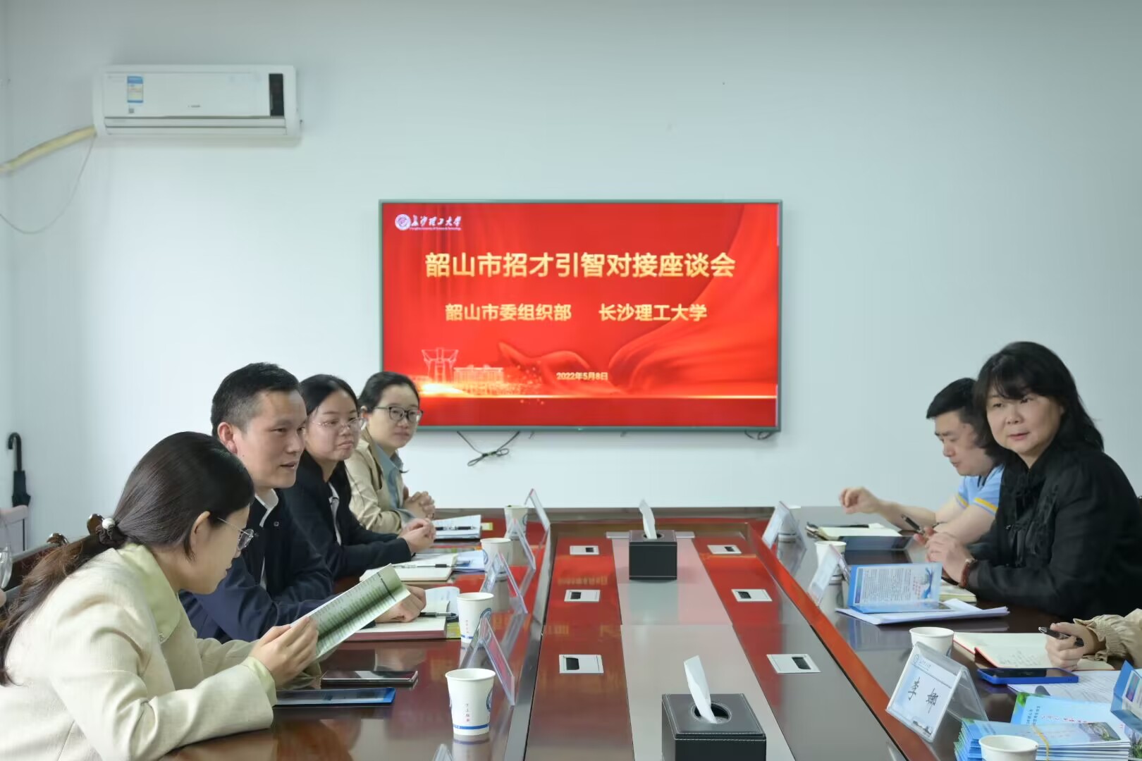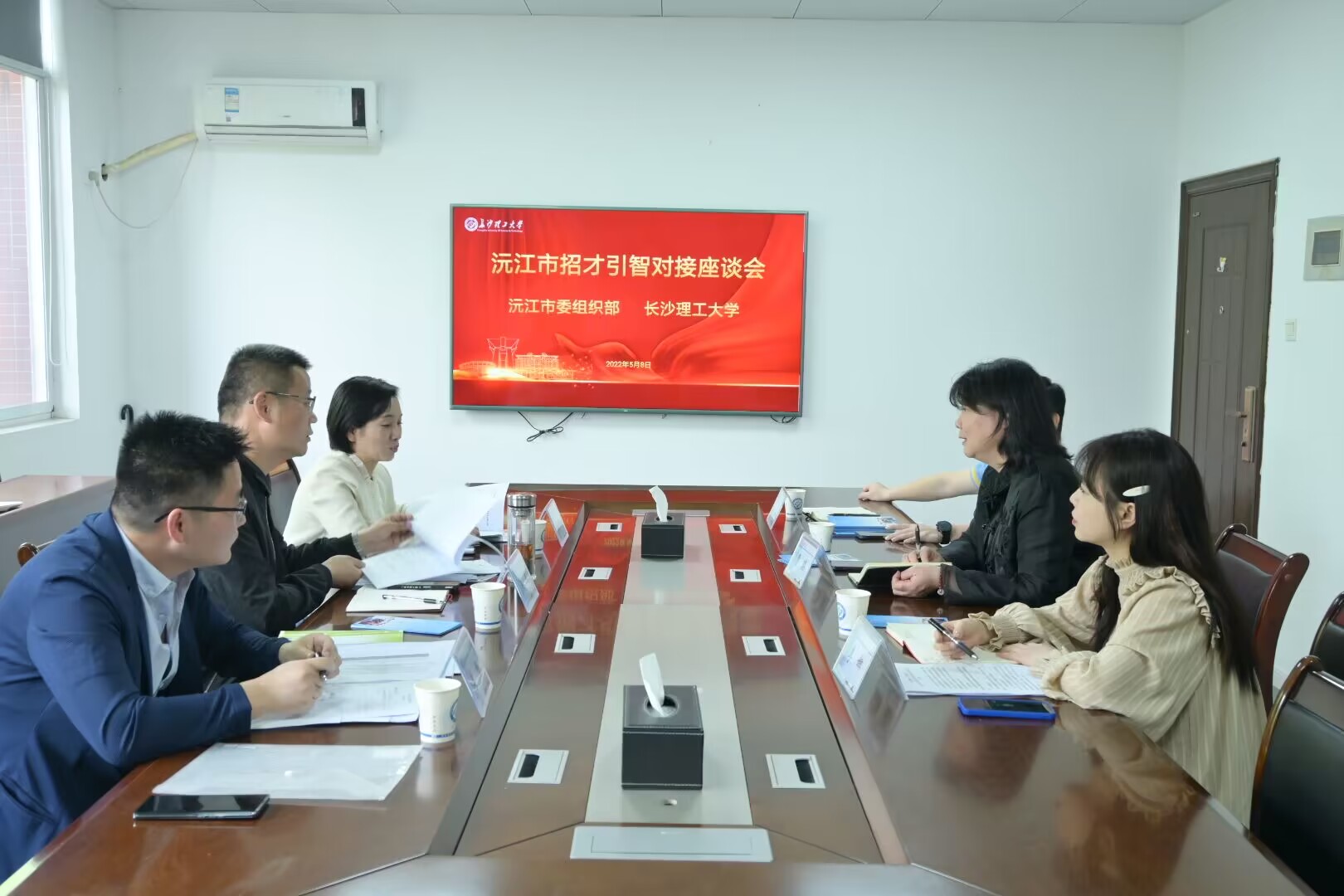 5月8日上午,韶山市委组织部常务副部长赵尚荣一行和沅江市委宣传部常务副部长吴波一行来永利官网商谈招才引智工作,招生就业处处长曹瑛、副处长李娜以及梁莹老师参与座谈交流。会议由招就处处长曹瑛主持。