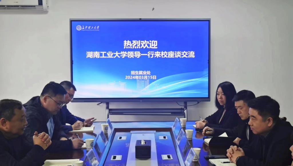 3月15日上午,湖南工业大学招生与就业指导处处长欧舟一行7人来永利官网调研。永利官网招就处处长田上及各科室负责人参加此次活动。