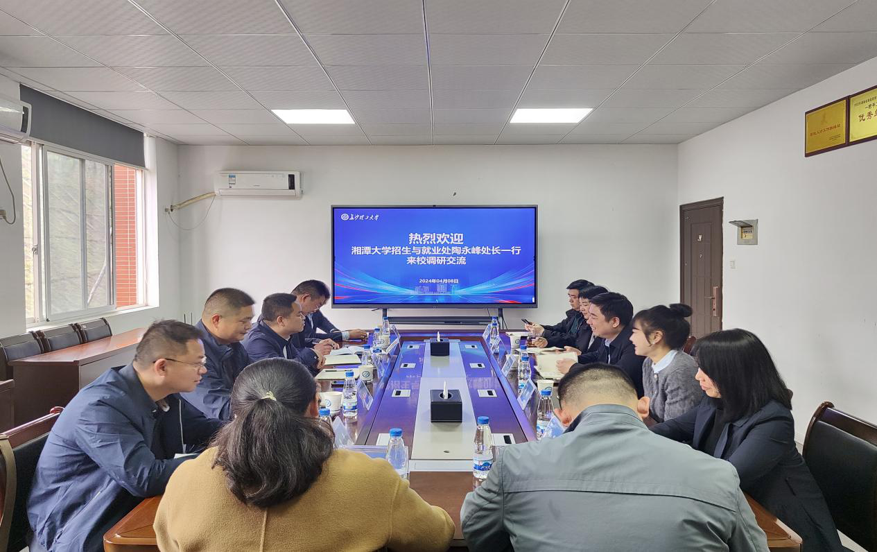 4月8日下午,湘潭大学招生与就业指导处处长陶永峰一行7人来校调研交流,永利官网招生就业处处长田上、副处长李娜及各科室负责人参加。