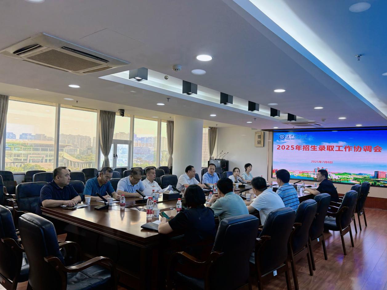 为保障本科招生录取工作安全有序开展,7月7日上午,学校召开2025年本科招生录取工作协调会。党委委员、副校长刘朝晖出席会议,党政办、纪检监察部门、学工部等职能部门及相关学院负责人,招生办全体成员参加会议。会议由教务处处长王威主持。